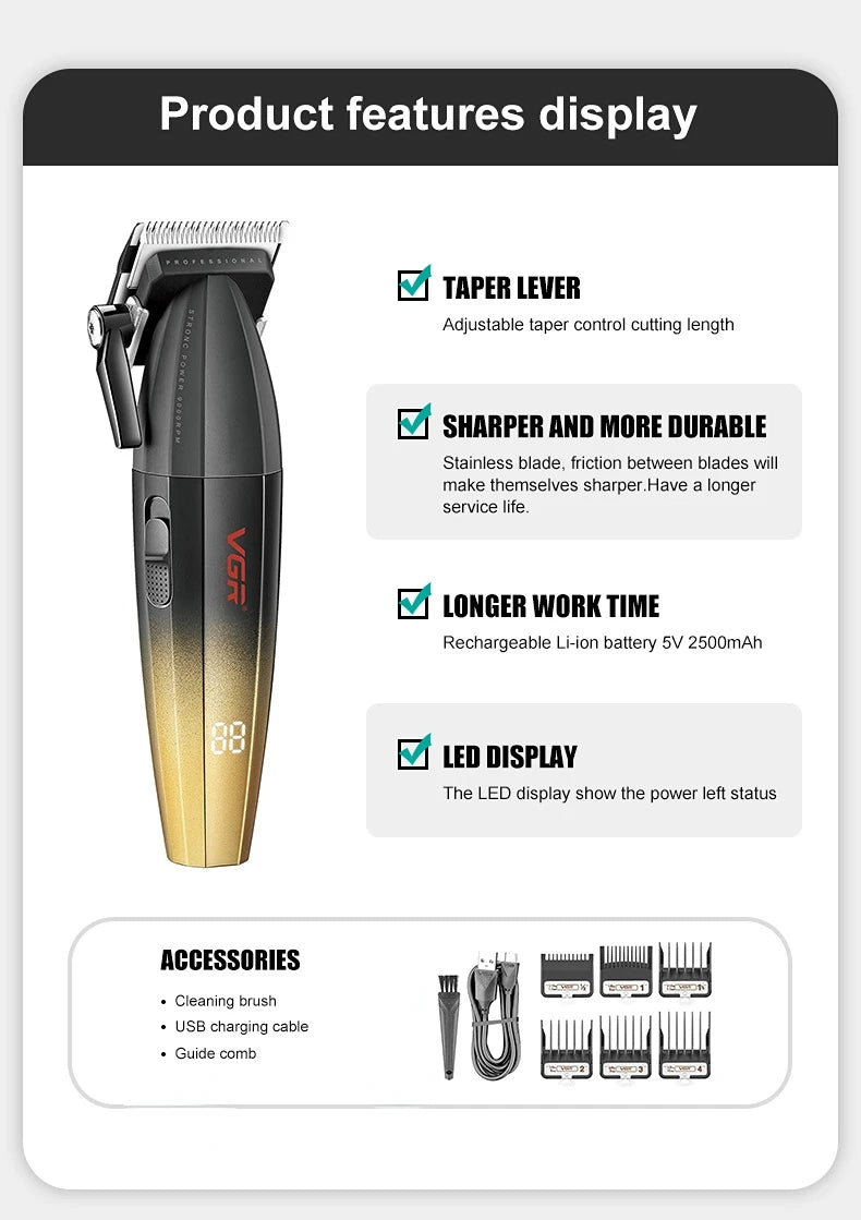 About This Product Professional-grade electric hair and beard clippers Rechargeable design for cordless convenience Sharp, durable blades for precise trimming Suitable for haircuts, beard grooming, and styling Ideal for home use and barber professionals